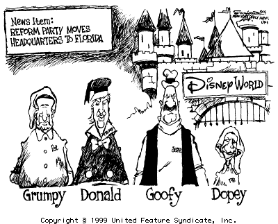 Which is why rumors are flying that Ventura's supporters asked Donald Trump to run for President under the Reform flag. Trump (like Perot and Steve Forbes) is yet another multi-billionaire who can spend his own money to fund his play at the White House. His major claims to fame are the various Trump-labeled businesses and buildings he owns, the fact that he was called "The Donald" by his second wife, Ivana, and the idea that if he wins, we'll have a succession of "First Babes" in the White House. |