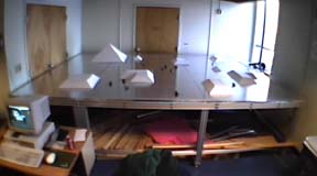 Here is the Ant Farm as of December 12, 1995. It's basically a 10' x 13' table 3 feet off of the ground. The little black dots on the left are six robots. The area the robots are sitting on is temporary so I could get some work done while I finished building the real surface. The real top will be made of 9 sheets of aluminum arranged in a grid, like a big Tic-Tac-Toe board.