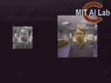 We would like Cog to be able to tell if someone is making eye contact withit. Using the face detection routines described above, we first locate a face in the peripheral camera. Using a learned sensory-motor mapping, Cog moves its eyes to look at that person. We then can use a second learned sensory-motor mapping to extract an image of that person's eyes. This clip shows the image processing steps used to find eyes. The upper right shows the raw video image and the upper left shows the outlined face images. The lower left is the prefilter results, and the lower right shows the extracted image of the eye. The image of the eye is not stable because the person in the video is moving almost continuously. |
