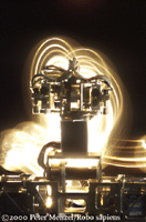 This clip shows some 1995 footage of Cog interacting with Prof. Rod Brooks. The robot is attending to visual motion, and orienting its head and neck toward that motion. The arm and hand motion shown in this clip are simple repetitive motions which are not interactive. |