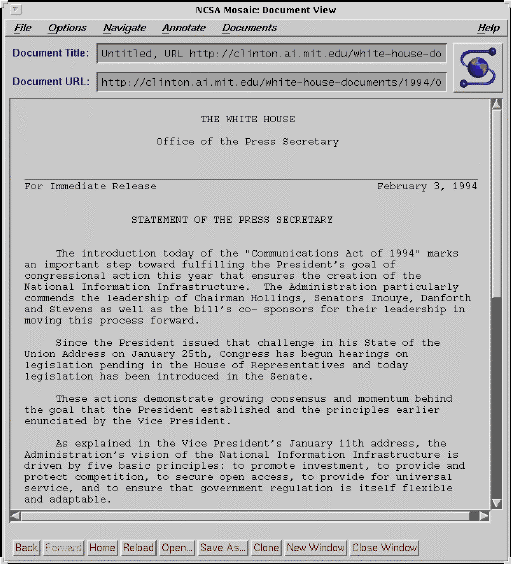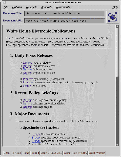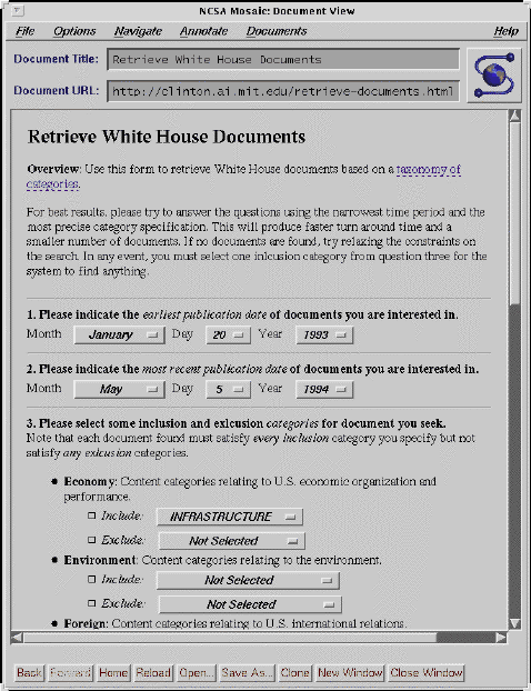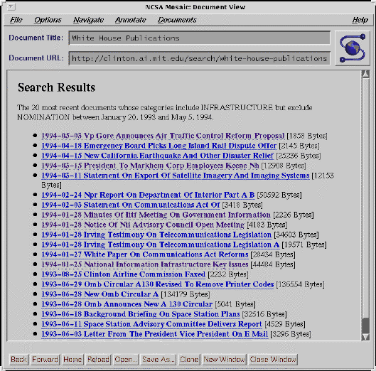 The page for retrieving documents offers a variety of way to access White House Electronic Publications. It includes a number of standing search URLs that automatically run a search when the user clicks on them.