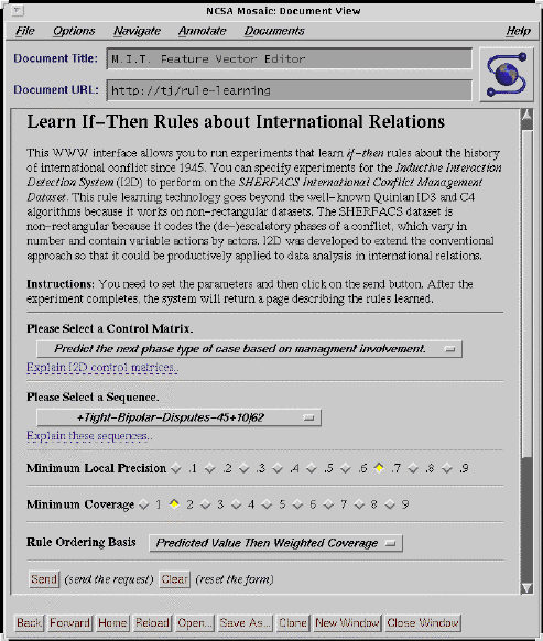 A graphical form authoring tool was written by Renaud (1994) for the COMLINK system. Coded in CLIM, the interface defines meta-level abstractions for forms, queries, and presentation types that allow users to define automatic surveys and forms without having to write LISP code. At the same time, the data structures are abstracted in a way that forms can be defined dynamically under program control. For the set of presentation types previously defined for COMLINK, Renaud defined new presentation and accept multimethods that dispatch on the HTML+ presentation view. This means that the same presentation type, which already worked for the email view, could now operate for the HTML+ view, displaying itself in HTML+ and accepting its input with the HTML+ form-processing facilities.