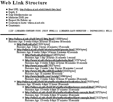 A simple application walks Web structures under a set of constraints and displays the resources traversed. This Web mapper is useful for viewing the link branching structure associated with a Web document and for testing constraint formulae to see what web region they select. This link mapper is invoked via a form over HTTP and reports its results back to the Web Client. Figure 1 shows the form that invokes the Web mapper. Some parameters for several standard constraints are captured via form input fields, whereas more specialized constraints are passed in via the constraints field. In Figure 1, a conditional constraint is used to suppress any HTML resources which were created before January 1, 1996 (specified in seconds since 1900). Consequently, the results shown in Figure 2 contain no HTML resources modified less recently than January 1, 1996.
