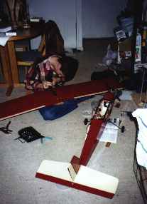 Jay Moore and I get our planes ready for taxi tests without the wings attached. Both planes are Goldberg Eagle II's. Mine, on the left, has a OS 40 FP engine. Jay's has a Super Tigre .45.
