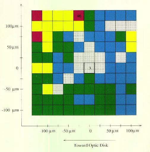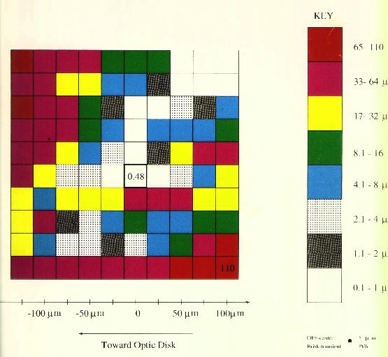 Methods. A retinal strip with attached pigment was isolated and superfused. A recording electrode was used to identify action potentials of individual axons; receptive field centers driving the axons were located in the peripheral retina. Monopolar electrodes were lowered onto the surface of the retina within the receptive field center, and the threshold needed to generate an action potential was determined using monophasic, cathodal stimulation for 20, 50, 100, 200, and 500ps, An X-Y-Z grid was made of the region surrounding the receptive field center for 13 retinal ganglion cells.