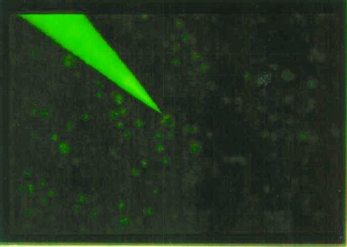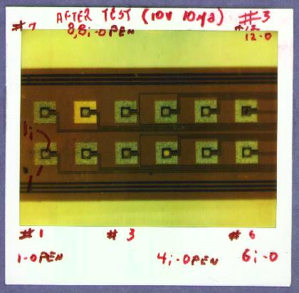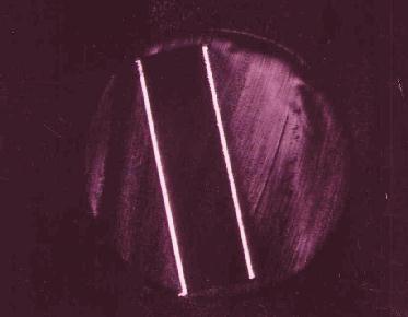 In preparation for an experimental test of this idea, we have constructed a novel type of electrode (Figure 15). A 250 micron thick sheet of fused silica, coated on each side with a 5 micron gold layer, was cut into strips 0.9 mm wide and inserted into a glass tube filled with liquid epoxy. After the epoxy had hardened,the tube was cut with a wafer saw to produce a clean exposed layer, shown below.