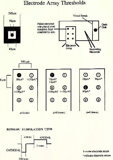 Three preliminary ganglion cell stimulations were performed with this array (Figure 17). One of the electrodes was located over the receptive field center, as indicated. Thresholds were then determined for this and neighboring electrodes. A biphasic, charge-balanced current waveform helped to avoid plating out the thin gold and platinum black layers. The first and third experiments used a distant return electrode behind the sclera, while the electrodes were driven in a bipolar fashion in the second.