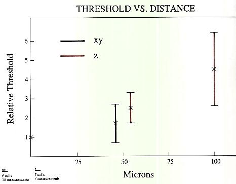 Stimulation threshold for ganglion cells increases with vertical (z-axis) displacement from cell body and horizontal (x and y axes) displacement. The plot in Figure 6 shows ratio of measured threshold at various positions to the minimum threshold observed in experiments like those shown at the top of this panel, These preliminary data for horizontal displacements of the electrode from 6 ganglion cells and vertical displacements from 7 cells show that thresholds rise only moderately for ou micron displacements in any direction, but go up steeply for vertical displacements of 100 microns. Data were obtained using 100 microsecond cathodal pulses applied through 10 micron platinum-iridium electrodes.