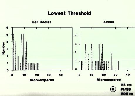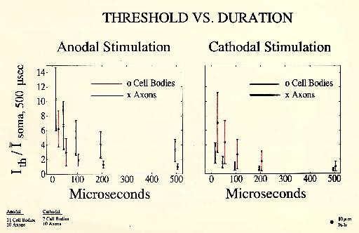 These experiments investigate the relation between axon and cell body thresholds using cathodal and anodal stimulation. For each recording the location was found that gave the lowest threshold using 200 microsecond anodal current pulses. The electrode was kept in that location for all subsequent stimulations of that axon or soma. To normalize the results, each soma and axon anodal threshold was divided by the average anodal soma threshold. Cathodal thresholds were similarly normalizied to the average soma cathodal threshold. Though the axon thresholds were lower than soma thresholds with cathode] stimulation, they rose to ,higher values than soma thresholds when anodal stimulation was applied, as predicted by the theory outlined above. These experiments suggest that anodal stimulation may be helpful in preferentially stimulating cell bodierather than axons. The data were obtained using 10 micron platinum-iridium monopolar electrodes (Figure 13).