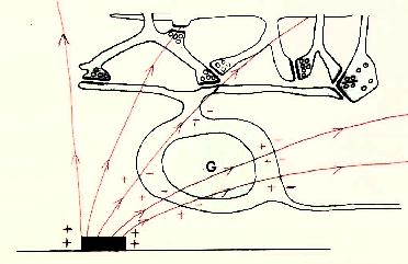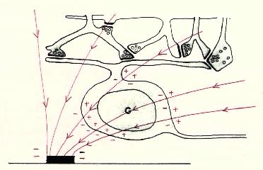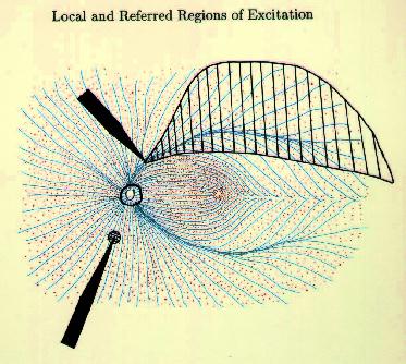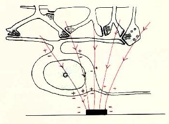 Figure 9 Local and referred regions of excitation For these reasons we have begun to investigate methods for selectively stimulating cell bodies rather than axons. Our experiments were motivated by the possibility that stimulation polarity might alter the relative thresholds of axons vs. cell bodies, as suggested in Figures 10-12 on the following page. Cathodal stimulation near the axon hillock may produce electric fields penetrating the cell body as shown in red at the left. These fields exit the cell so as to depolarize the membrane at the hillock, leading to a low stimulation threshold. But cathodal stimulation far from the axon hillock could create fields entering the cell at the hillock as shown in the center figure, leading to hyperpolarization there and elevated thresholds for cell bodies. This undesirable outcome might occur frequently, since we have no control over the location of individual electrodes on an array relative to cell body location. In such cases, the threshold might be lowered by reversing the polarity as shown below, right, causing field lines to once again exit the cell near the axon hillock. This may lower the firing threshold for ganglion cell bodies.