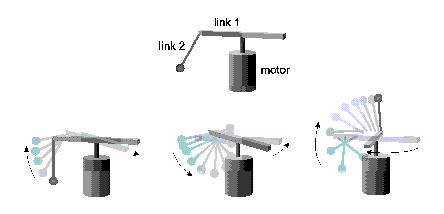 State variables were discretized by an uneven `ad hoc' partitioning of the state space. A finer discretization was used around the bottom and the top positions of the vertical link. The controller `sensed' only the code of the discretized state space. We tried different discretizations; the results shown here make use partitioning detailed in Table 3.