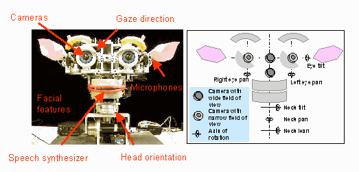 The Hardware DesignKismet is an expressive robotic creature with perceptual and motor modalities tailored to natural human communication channels. To facilitate a natural infant-caretaker interaction, the robot is equipped with visual, auditory, and proprioceptive sensory inputs. The motor outputs include vocalizations, facial expressions, and motor capabilities to adjust the gaze direction of the eyes and the orientation of the head. Note that these motor systems serve to steer the visual and auditory sensors to the source of the stimulus and can also be used to display communicative cues.